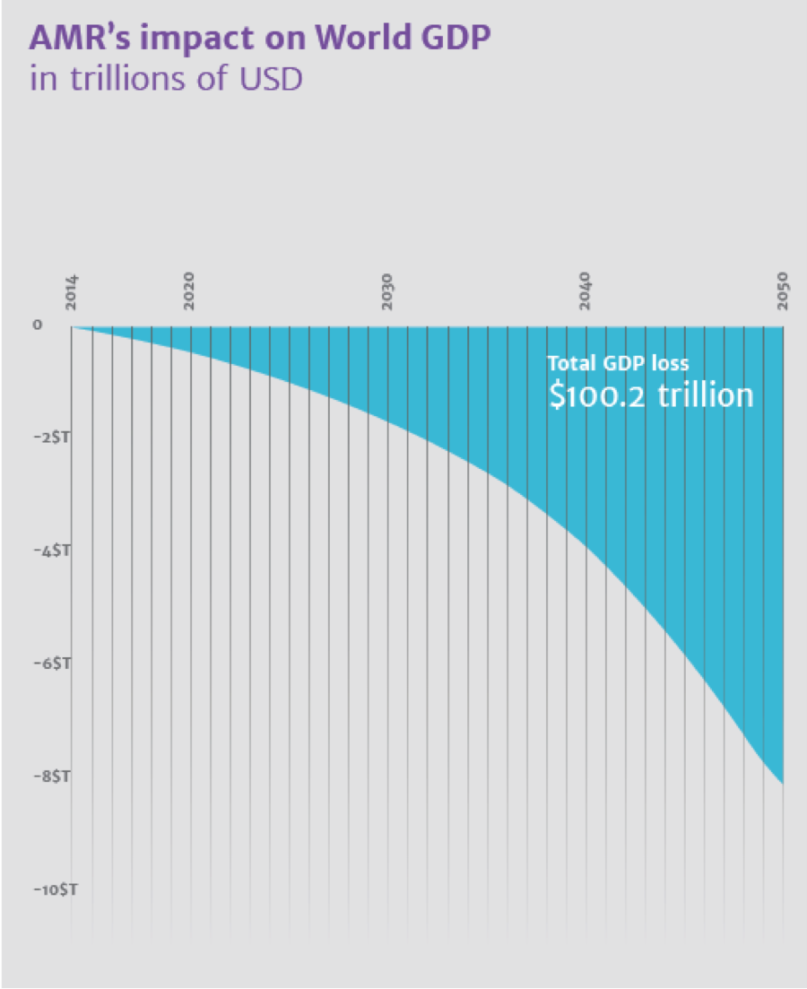 I don’t need to point out that the O’Neill Commission (as I call it) predicted 10 million deaths worldwide from antimicrobial resistance (including TB and Malaria) by 2050 if current trends continue. The cost to society globally could be as high as $100 trillion in lost GDP.